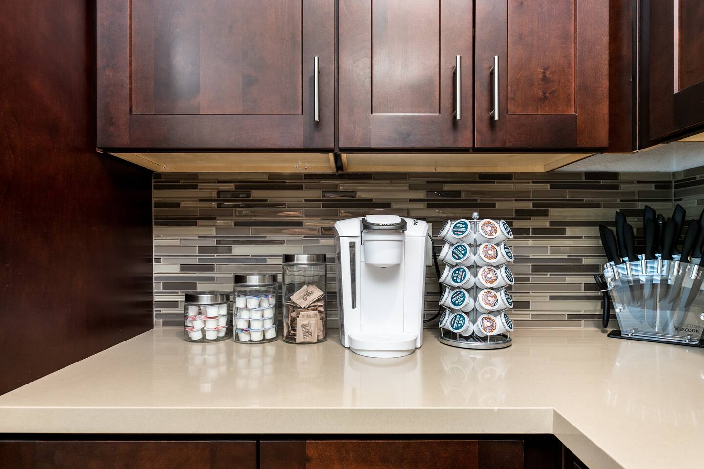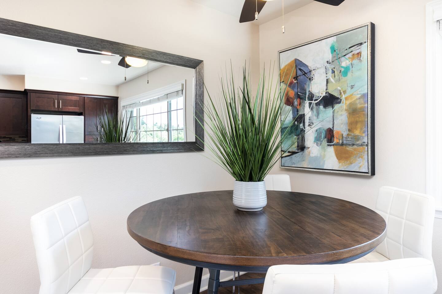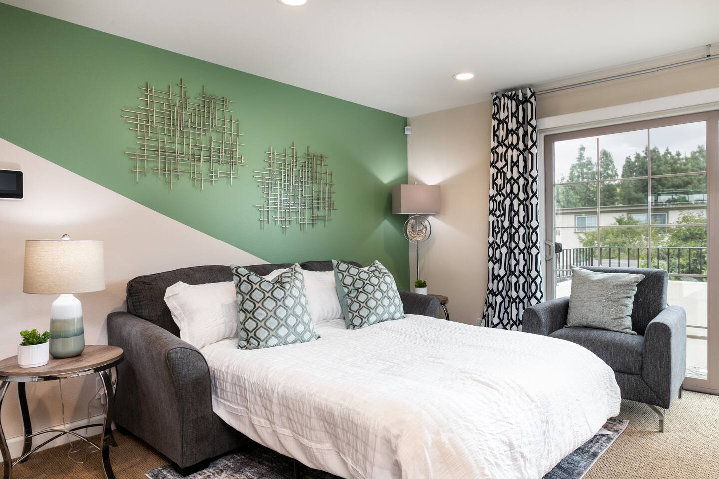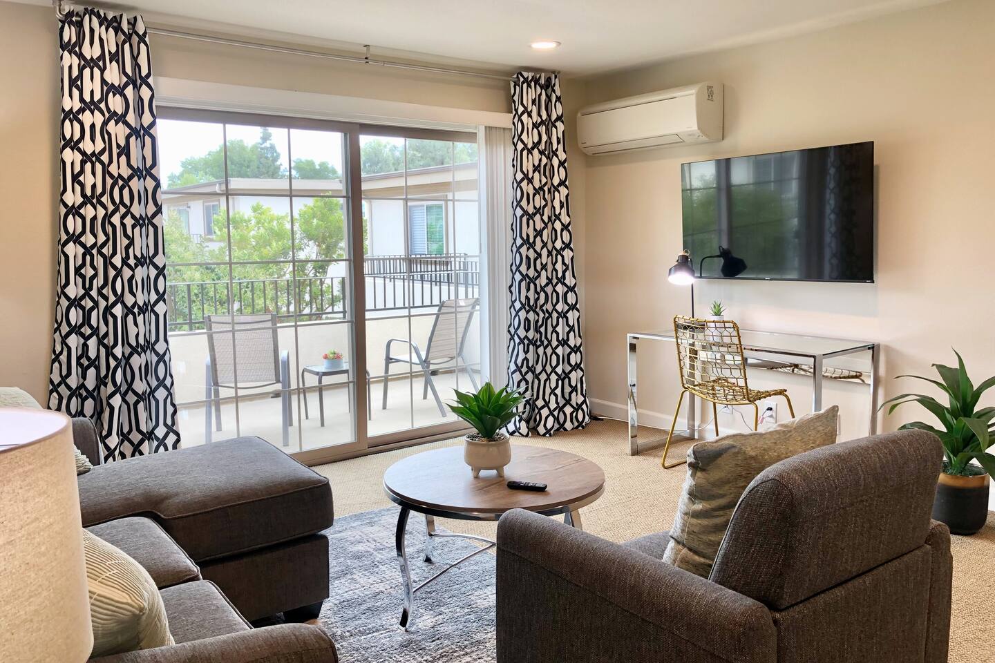 Relax in the serenity of our 2 bed 2 bath apartment with plush King beds in each bedroom. Smart TV's thought and a full kitchen with all the basic essentials for home cooking! In evening, you can enjoy the night air on the outdoor patio while listening to the tranquility of the common area water fountain from down below.